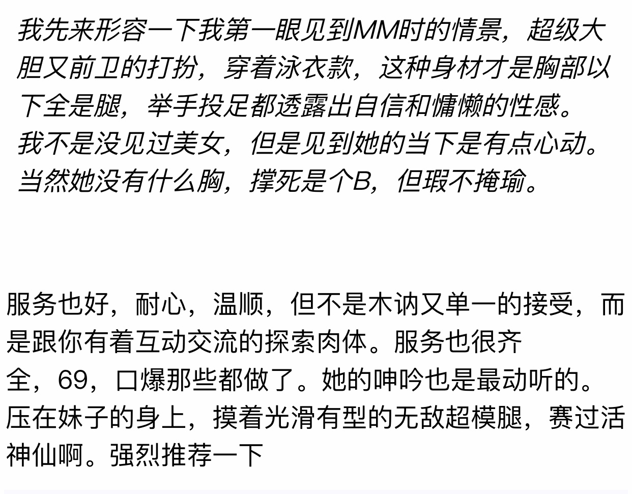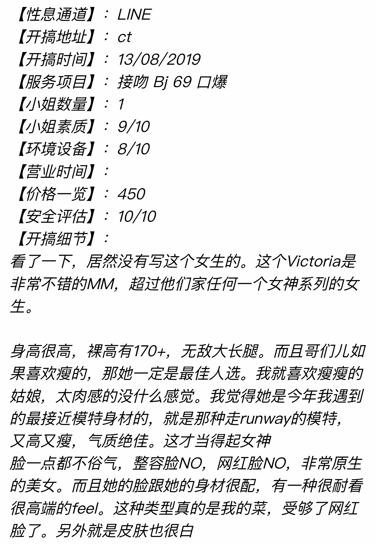 【色色家女神103号 @惊世推出超诚意力荐长腿模特身材极品空姐 Victoria 】实力惊炸天200%好评反馈,天然笔直长腿吸精,170cm 49kg B+ 21岁,脸蛋清纯明媚元气满满绝无整容,国民初恋感校园长腿美女,长发飘飘,嫣然一笑电力十足,高挑修长模特身材,气场惊艳回头率过万,内心纯然如璞玉,单纯率真,笑容能解千愁,热情善谈不缺话题绝不冷场,绝妙好服务无条件接受Biu嘴 Biu脸蛋,绝逼独门解锁服务秘籍,戳客服可以看小视频。
